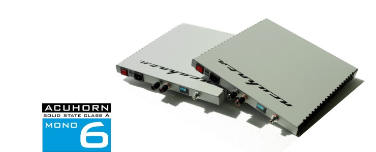 acuhorn Mono 6 solid state amplifiers. Single ended, class A. Hi-tech architecture amplifier with Vicor modules DC-DC converters. Audio path solid core PCOCC copper.