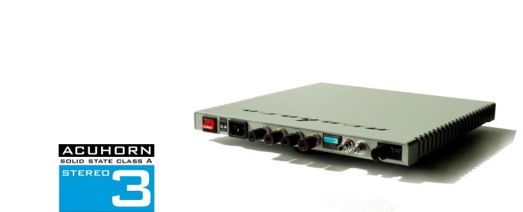 acuhorn Stereo 3 solid state amplifiers. Single ended, class A. Hi-tech architecture amplifier with Vicor modules DC-DC converters. Audio path solid core PCOCC copper.